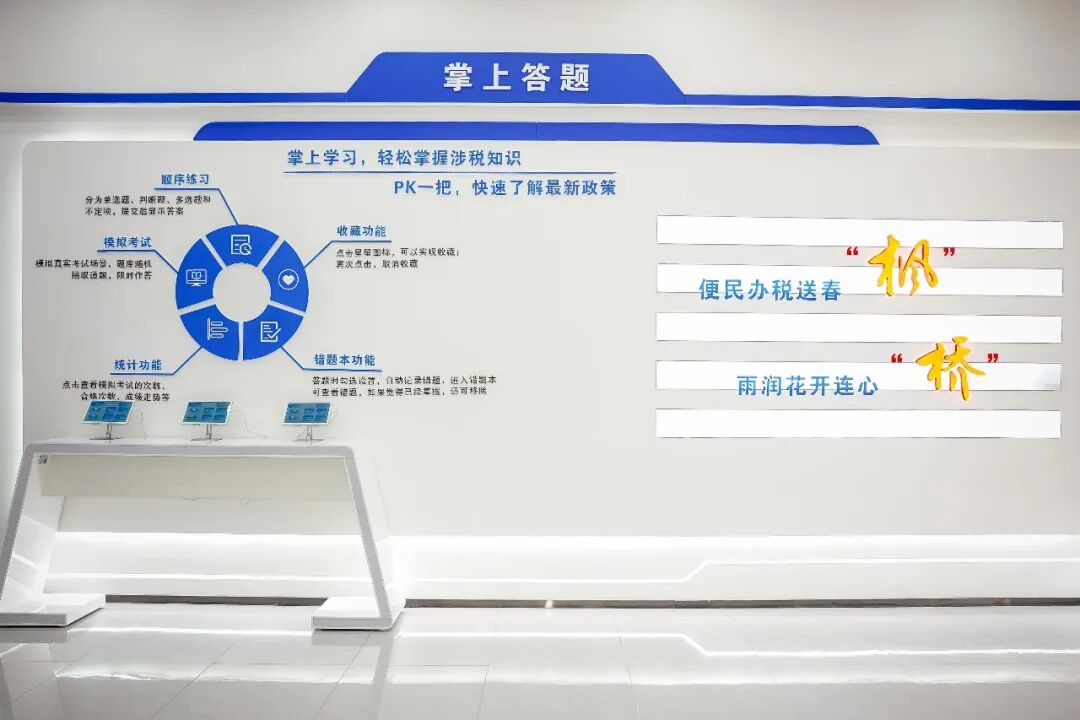 此外,“智慧办税客厅”还突出“学办一体”功能,配置新办纳税人辅导专区、纳税人答题体验区、掌上互动办税体验区、纳税人讲堂等纳税人云学堂体验区域,引导纳税人在此区域查询税费政策、参与知识答题。