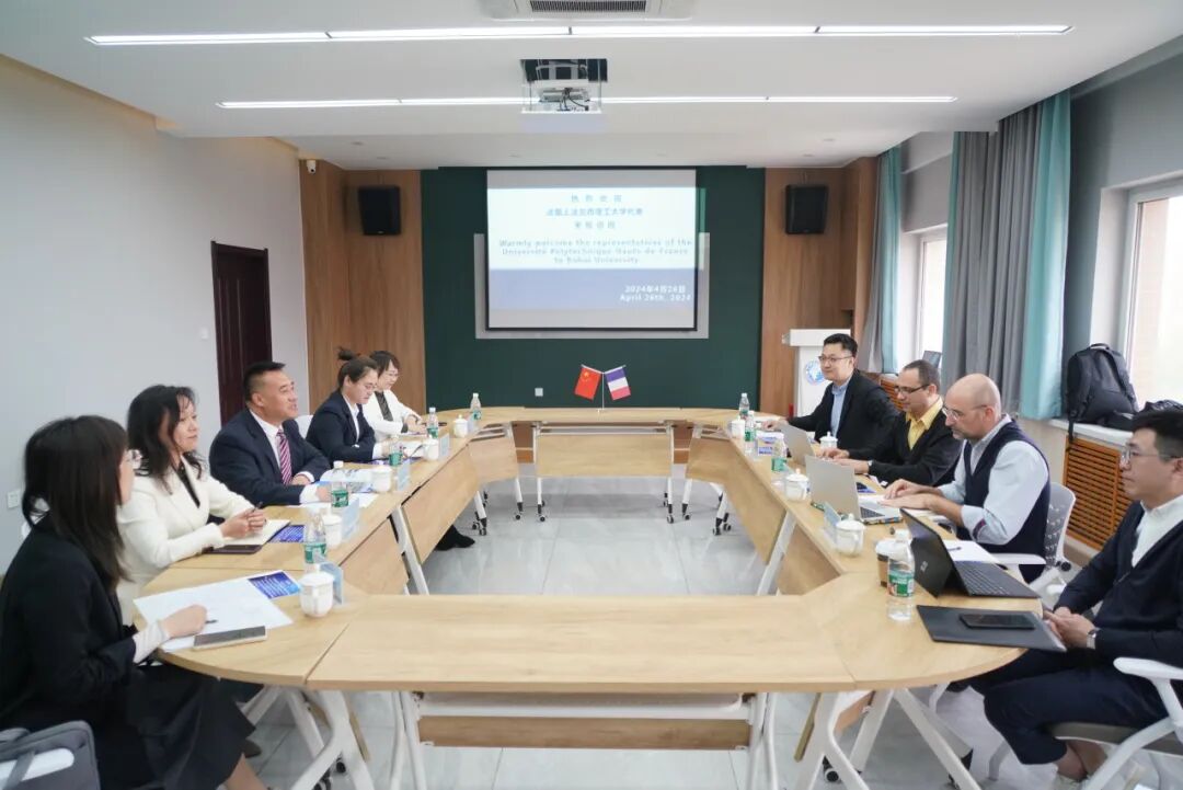 4月26日,法国上法兰西理工大学一行4人来校访问,国际交流与合作处处长赵真华会见上法兰西理工大学国际合作与关系部主任Jonathan Brindle(乔纳唐·布朗德利),社会人文学院国际合作负责人、语言文学系主任Vassil Mostrov(瓦兹勒·莫斯托夫),以及驻中国校方代表于辛陶、全艺松。国际教育学院副院长张俊秀,外国语学院副院长张璐璐、胡帅,法语教研室主任王楠楠参加本次会谈。