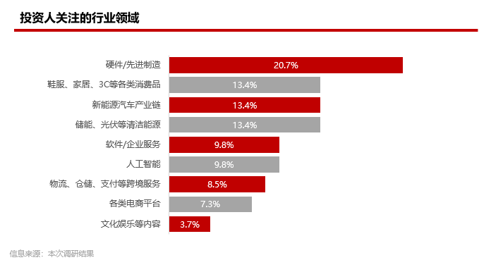 行业聚焦:投资人特别关注硬件与先进制造、新能源汽车产业链、清洁能源、消费品出海、软件与企业服务以及人工智能等赛道机会。