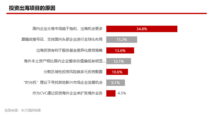此外对于投资人来说,海外项目估值普遍具有性价比(12%)、以及满足多元化区域投资的需求(11%)等都是不同类型机构考虑出海项目的重要因素;