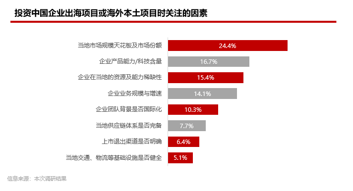 产品能力同样是重要考量因素(比例达17%),这也印证前述投资人认为中国企业出海最大的竞争优势;此外企业在当地能获取的资源及能力的稀缺性也是投资人主要看重的因素之一(比例达15%)。