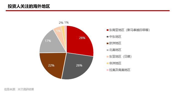 关注中东地区的投资人比例紧随其后达到26%,近两年来“中东热”已成为现象级主题,以沙特为代表的中东国家正逐渐成为中国企业出海的首选之地;