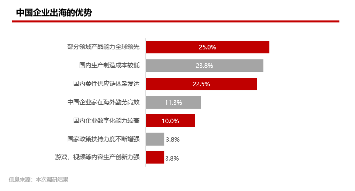 中国企业出海优势:产品能力、制造成本优势和供应链完善度是中国企业在海外市场的主要竞争优势。