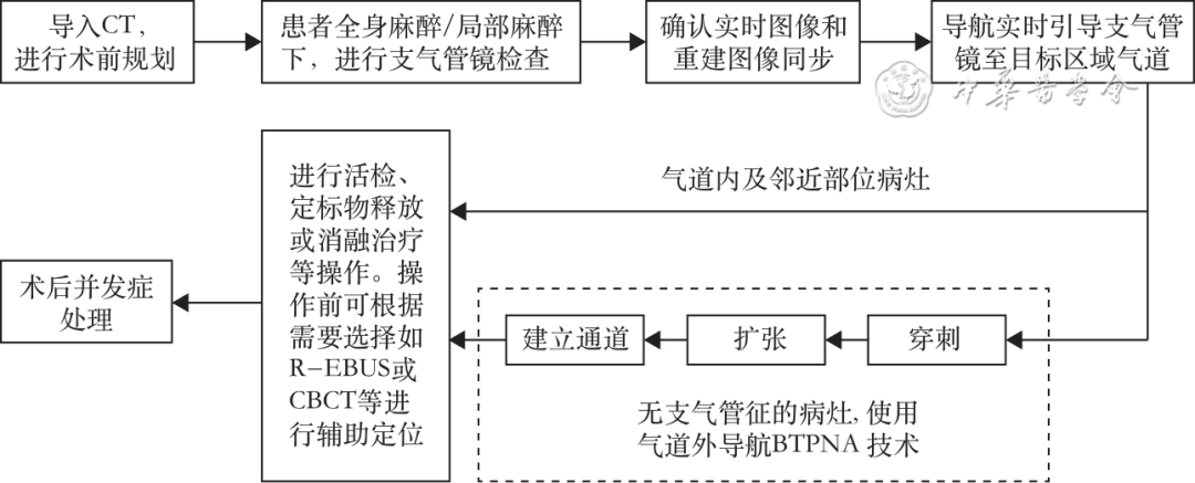 (1)患者取去枕仰卧位,全身麻醉/局部麻醉就绪后,进行常规支气管镜检查,清除残留气道分泌物,观察气道黏膜及管腔走形。(2)观察支气管镜实时图像和重建支气管图像的匹配度。当实时与重建支气管图像同步时,达到靶点的蓝色路径将显示在实时支气管镜影像上;如自动同步失败,需及时通过旋转或调整重建支气管视图使影像同步。(3)按照术前规划的路径,在导航实时引导下推动支气管镜至靶病灶区域的气道;当蓝色路径、邻近血管和靶点叠加显示在实时支气管镜影像上,则提示已到达路径末端的预设范围内。(4)可根据结节所在位置直接取材,或通过辅助定位设备如R-EBUS或CBCT等确认后活检,或根据手术需要进行定标物释放或消融治疗。(5)经气道支气管镜导航时,可联合/不联合支气管内超声系统等辅助支气管镜对气道内及邻近病灶部位进行诊断、定位及治疗;气道外支气管镜导航适用BTPNA技术,可对无支气管征的肺外周结节进行诊断、定位及治疗(图1)。首先支气管镜在导航的引导下到达规划穿刺点区域,穿刺针经工作通道于穿刺点处穿刺破壁造孔,接负压注射器确认有负压且无出血后取出,再置入鞘管取出鞘芯,置入球囊并充气扩张穿刺孔,引导鞘管穿出气道到达肺实质,插入鞘芯,最后通过CBCT或C形臂下X射线透视引导视图推送钝头鞘管抵达病灶处,完成通道建立。后续可在透视监视下进行活检、定位或治疗。需注意是否有出血、气胸等并发症。