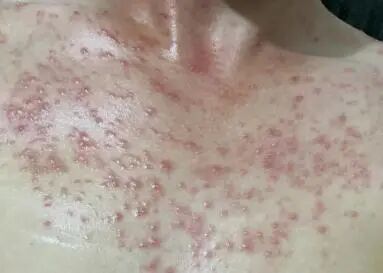 马拉色菌毛囊炎多见于夏、秋季节,前胸后背、肩颈这些皮脂腺丰富的部位,很容易长出半球形的丘疹、光滑圆润,密密麻麻,大小均匀,一般会对称分布在皮肤上,有时还会出现脓疱。患者会感觉到瘙痒、刺痛,一热一出汗尤其明显。