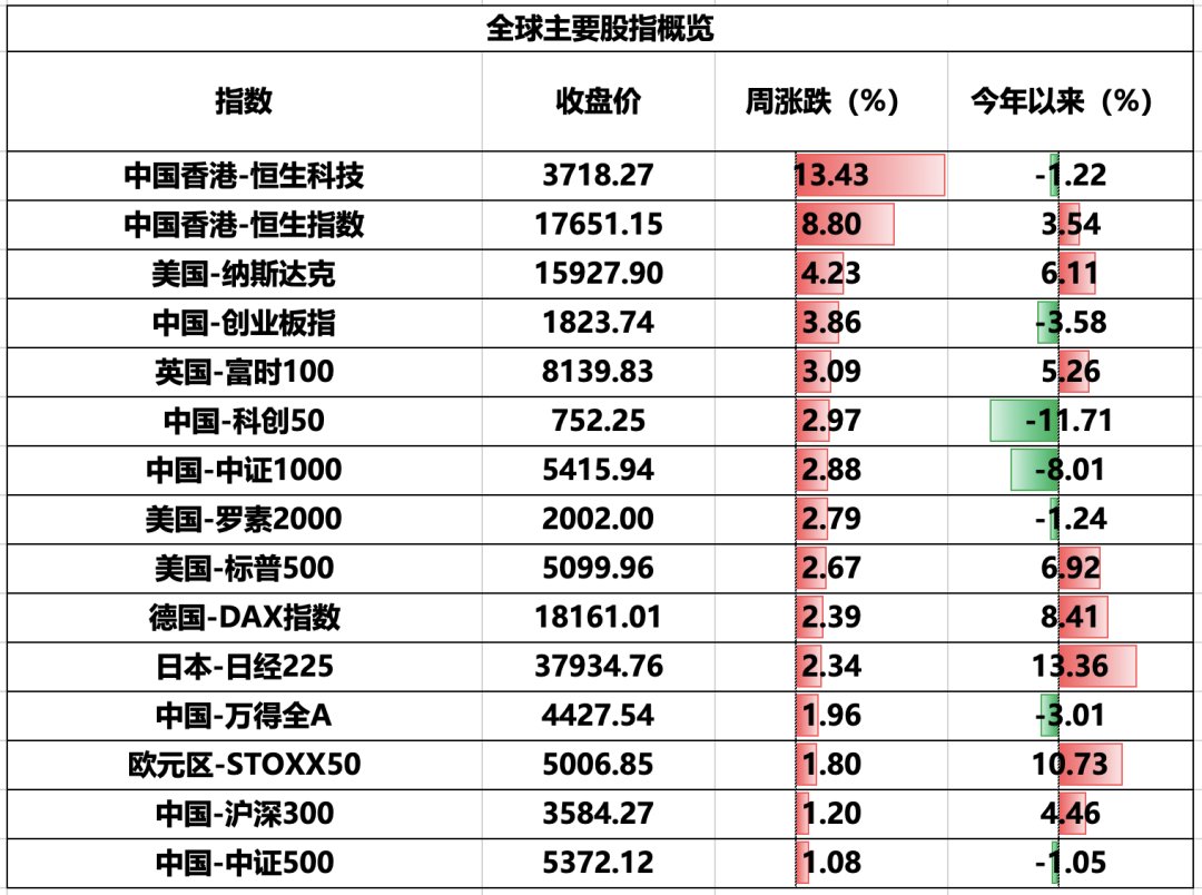 港股当周强势上涨,豪取五连阳。恒生指数周一即站上半年线,并在周五一度站上年线,最终收于17651点,创去年11月底以来新高。恒生指数周涨8.8%,创2011年10月以来12年多最大周涨幅。国企指数涨9.1%,创2015年4月以来9年最大周涨幅。恒生科技指数亦涨13.4%,为2015年开通以来第四大周涨幅。行业板块全线飘红,资讯科技涨15%,医疗保健涨11%,地产建筑涨9.2%。前期强势板块原材料、能源仅涨1%有余。南向资金继续保持单日净流入,全周净流入103亿港币。港股市场当周出现突破性走势,后市可高看一线。