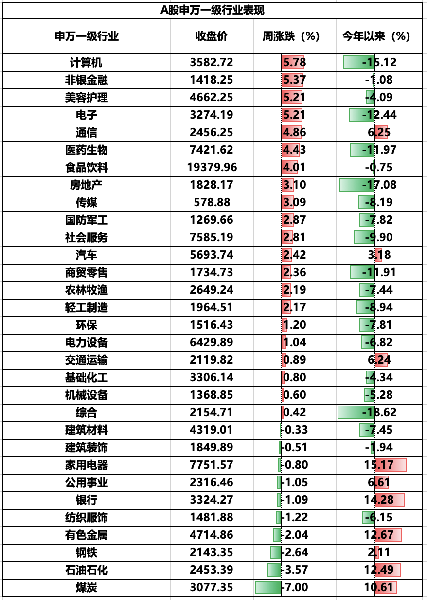 本周A股市场上涨,价值成长板块呈现高低切换,上证指数周涨0.76%报收3088.64点,沪深300、中证500、中证1000、创业板指、科创50上涨1.20%、1.08%、2.88%、3.86%、2.97%。本周北上资金累计净流入257.96亿元,本周A股放量上涨,周五沪深两市成交额达到1万亿级别。各板块涨多跌少,计算机、非银金融、电子板块涨幅居前,分别上涨6.31%、5.28%、5.03%,煤炭、石油石化、钢铁板块表现不佳,分别下跌7.18%、3.37%、2.54%。