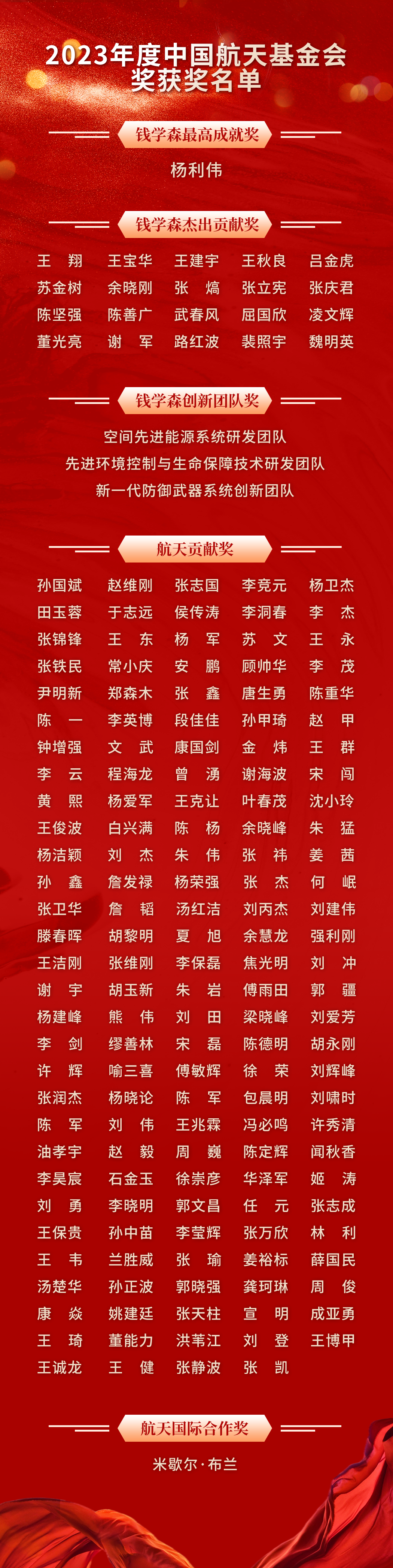 其中,中国载人航天工程副总设计师、航天英雄、特级航天员杨利伟获得“钱学森最高成就奖”;王翔等20名个人获得“钱学森杰出贡献奖”;孙国斌等149名个人获得“航天贡献奖”;空间先进能源系统研发团队、先进环境控制与生命保障技术研发团队等获得“钱学森创新团队奖”;法国米歇尔·布兰获得“航天国际合作奖”。