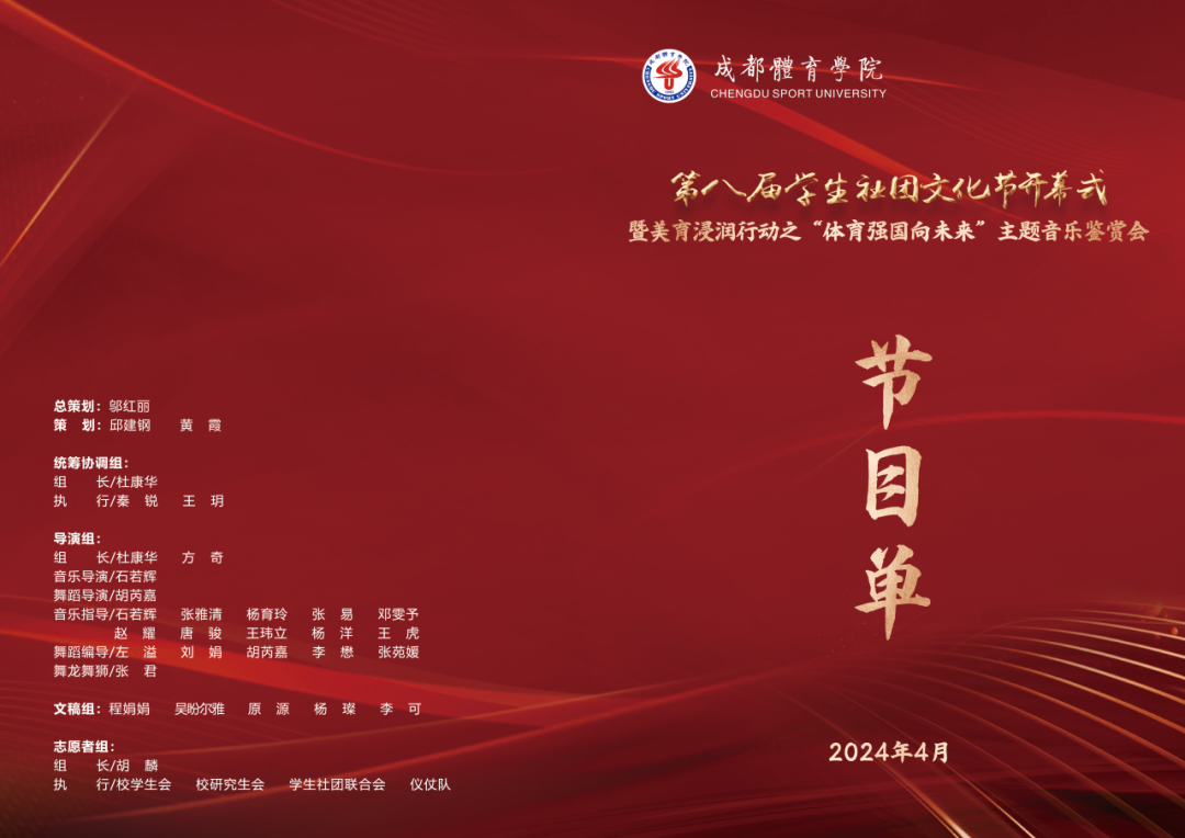 成都体育学院第八届学生社团文化节充分把握新中国成立75周年、学校新校区整体搬迁的重要时刻,以“我爱我国,我爱我家”为主题,围绕“厚植家国情怀”、坚持五育并举,面向全校学生开展15项主体活动,贯穿全年。