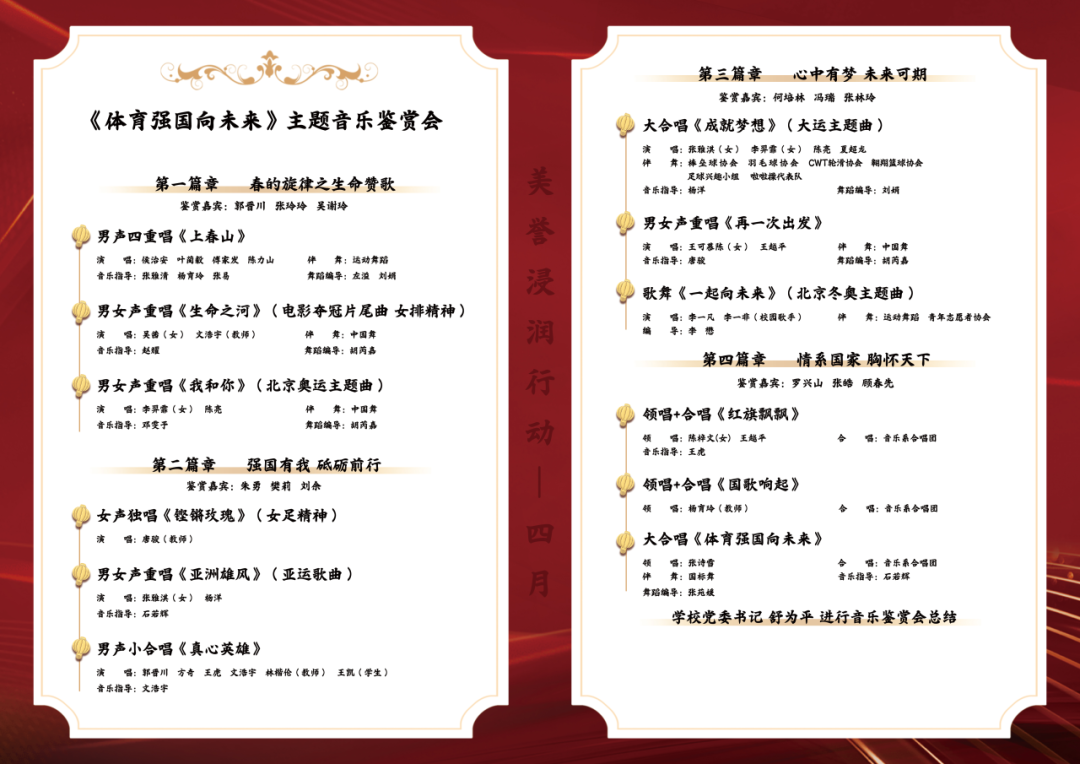 成都体育学院美育浸润行动是为深入学习贯彻党的二十大精神,进一步加强学校美育工作,强化学校美育的育人功能,贯彻落实《教育部关于全面实施学校美育浸润行动的通知》要求,面向全校师生开展的。围绕“美育浸润心灵 艺术涵养生活”主题,结合学校办学特色、人才培养、校园文化与重要节日庆典实际,开展“体育强国、多彩校园、再见成体、感谢恩师、我爱我的国、你好新校区、向新而行”7场不同主题、不同形式的室内外音乐鉴赏活动。充分发挥不同岗位教师的美育功能,分场次分阶段分主题邀请学校领导、各学院学生工作负责人、专任教师、辅导员担任美育鉴赏嘉宾,提升全员美育意识和美育素养,以美育浸润学校,打造昂扬向上、文明高雅、充满活力的校园文化,建设时时、处处、人人的美育育人环境。