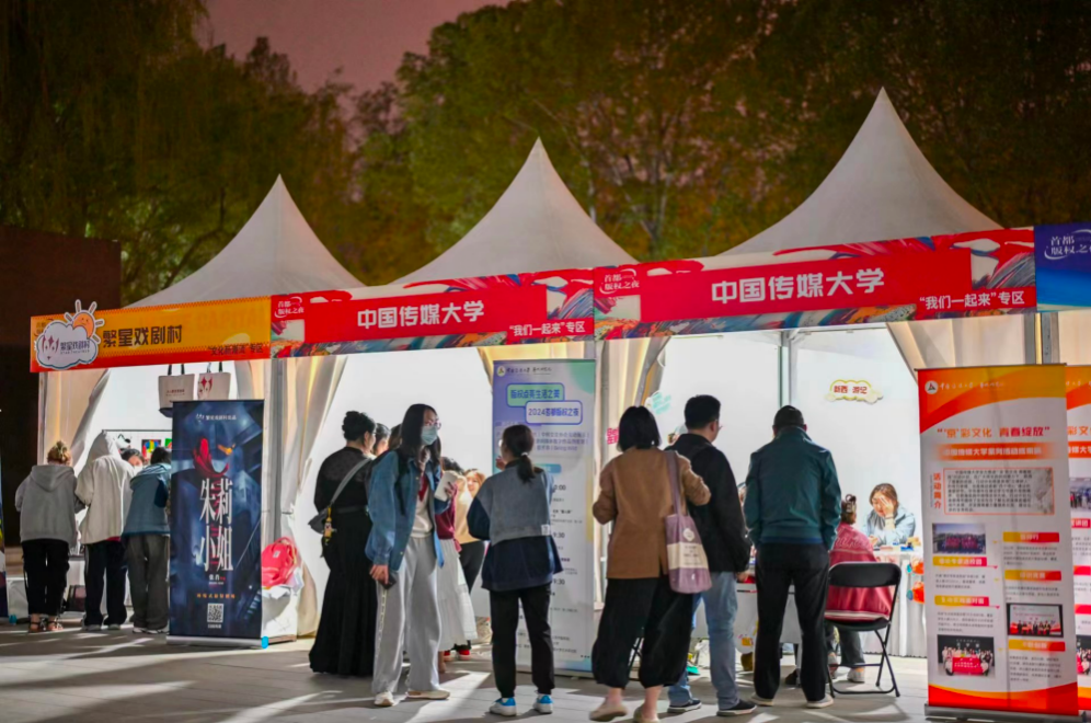 由首都版权协会、中国传媒大学艺术研究院承办的2024首都版权之夜于4月19日至21日在中国传媒大学阅读广场举行,活动包括文化传承创新、非遗技艺互动、潮玩与AI互动体验等内容的展示和开心麻花等拥有优质原创作品的文化公司、演出团队入校的展演,中国传媒大学灵传数藏、中韩交流协会等众多学生社团也参与了此次活动。![]()