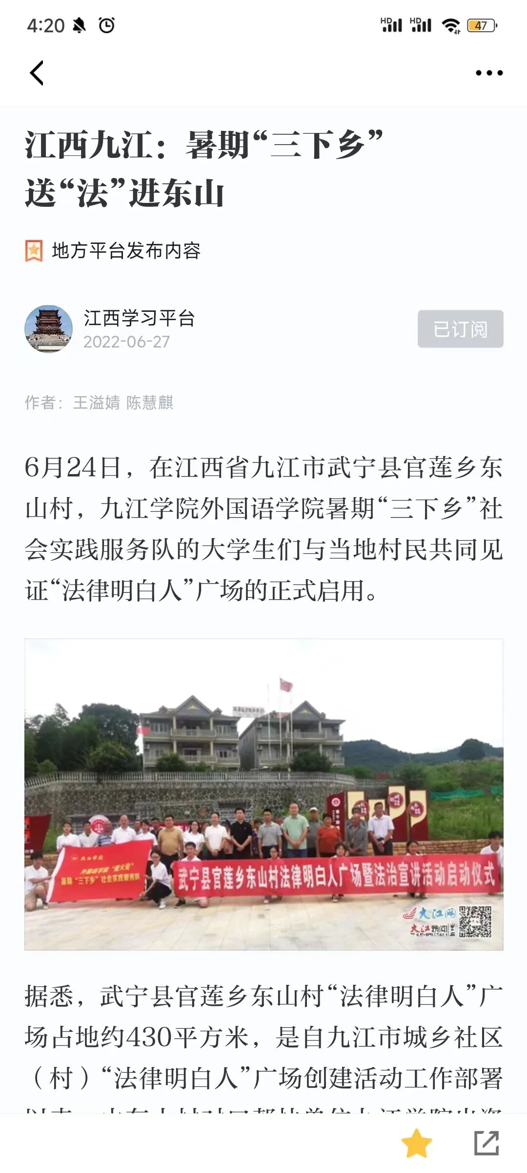 在大学生暑期“三下乡”社会实践期间,刘辰雨参加的“萤火虫”团队赴武宁县东山村,开展送“法”进乡村活动,基于该实践所撰写的调研报告《萤萤之光,灼灼其华》被中国青年网、江西思政、大江网等多家媒体报道。