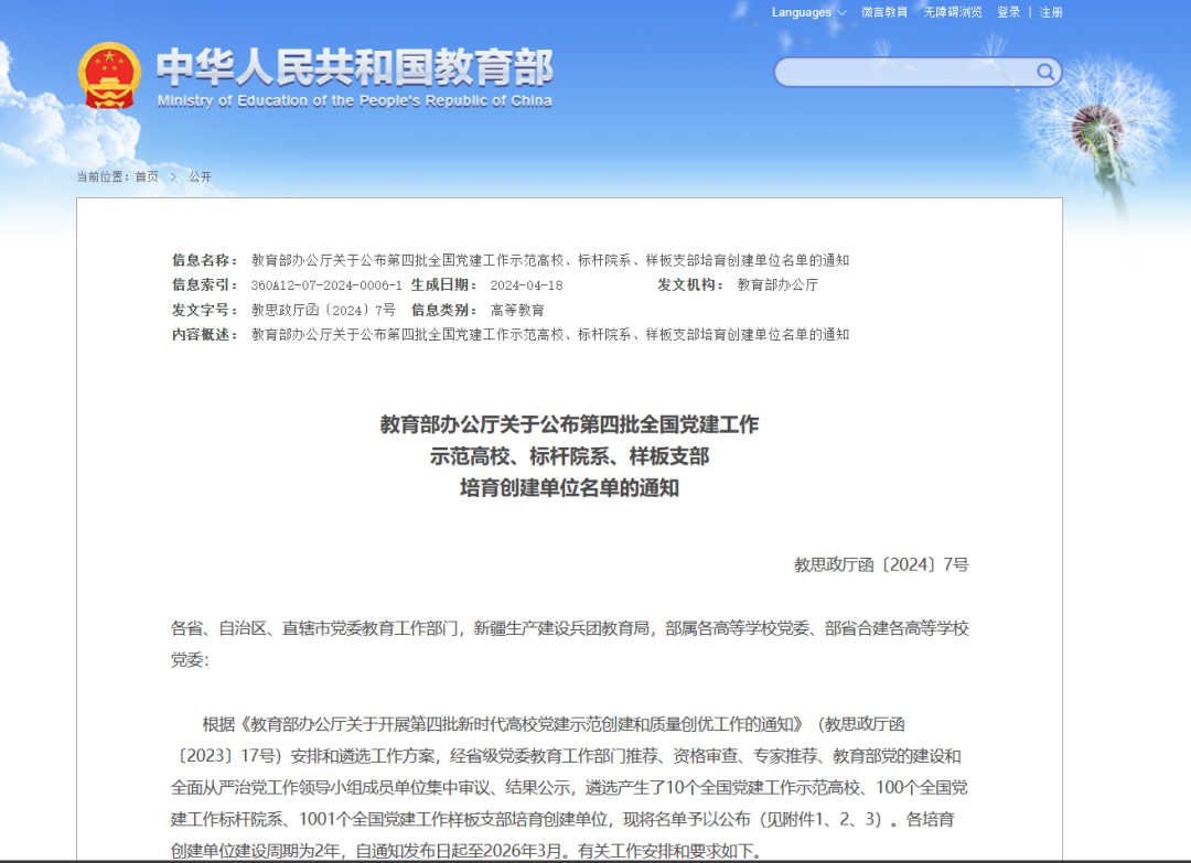 近日,教育部办公厅发布《关于公布第四批全国党建工作示范高校、标杆院系、样板支部培育创建单位名单的通知》,我校商务与管理学院学生商务管理支部入选“全国党建工作样板支部”培育创建单位,是学校入选的第4个全国样板支部。