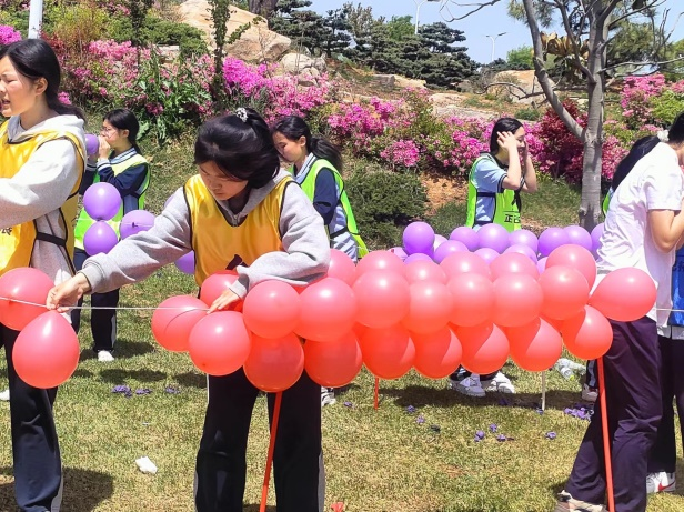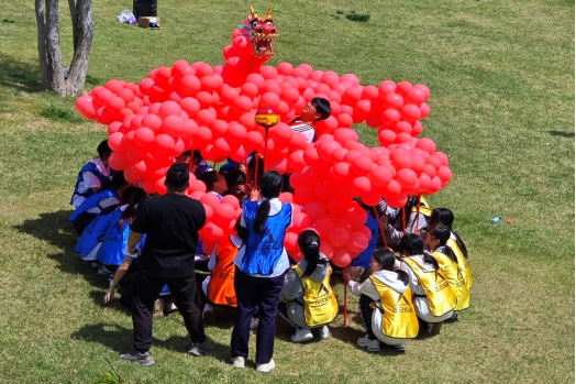 将全体同学分成2支队伍,为每支队伍提供“龙的骨架”,队员利用工具吹气球,并将气球绑在骨架上,组成“龙鳞”。经过同学的努力,“紫气东来”与“中国红”两条龙逐渐成型。在制作过程中,大家相互鼓劲,同学们的集体荣誉感与凝聚力得到了极大提升。