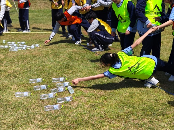 从成员中推选出一名队员当“排雷者”,借助其他队员的帮助使身体悬空将矿泉水从5米见方的正方形雷区中安全取出,在取水过程中,“排雷者”全身不得接触地面,需要其余同学用自身的力量来拉住该队员,从而考验成员之间的观察力与决策能力,增进同学间的相互信任与理解。