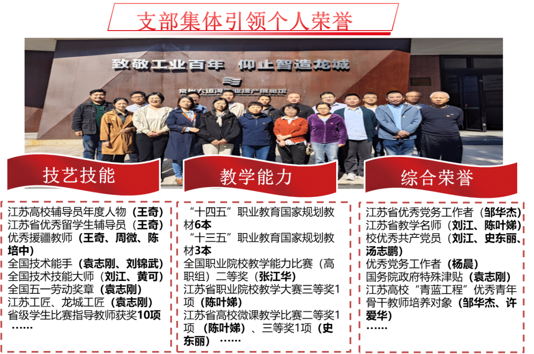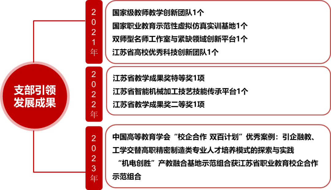 3年来,8名党员被评为“党员示范岗”。教师党员在教学能力竞赛、指导学生竞赛等方面获得省级以上表彰50余人次,发表核心及以上期刊论文25篇,立项省级以上课题7项,申请发明专利22项,帮企业解决技术问题12个,“一路‘格桑花’同伴互助促成长”项目入选2023年“博爱青春”暑期志愿服务省级支持项目。为印尼等“一带一路”国家培训师资50余人次。学生党员获得省级以上表彰20余人次。