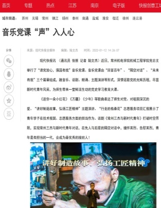 支部通过网站、媒体、微信公众号等进行追梦人系列报道20次,宣传优秀党员的先进事迹。支部结合党史学习教育,开设音乐党课“当代青年与常州三杰的对话”,共有23名师生党员参演,600多人次观看。