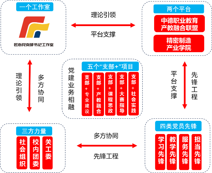 2:搭建精密制造产业学院、中德职业教育产教融合联盟两个平台,为党员能力素质提升创造条件,增强了党支部凝聚力和号召力。联合举办“百年党史浮雕作品展”,提供教师企业实践机会,培养工匠型教师6名,为学生争取优质顶岗实习机会26个,提升就业质量。