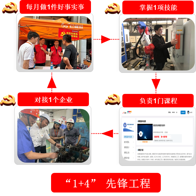 支部实施“党员积分银行”、教师党员“1+4”先锋工程、学生党员“五个一”工程。“1+4”先锋工程,即每名教师党员每月做1件好事实事、对接1个企业、掌握1项技能、负责1门课程,充分发挥党员教师先锋模范作用;学生党员“五个一”工程,一是阅读原著,读书笔记每月一记;二是关心时事政治,时政感悟每月一篇;三是积极参与社会实践,志愿服务每月一起;四是服务身边同学,帮学助困每月一次;五是用好“学习强国”平台,每周100分,充分发挥学生党员先进性。