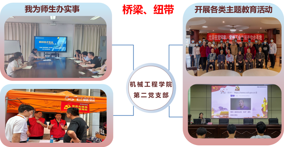 支部做好师生贴心人,成为密切联系师生的桥梁和纽带,深入开展“我为师生办实事”等行动,营造师生“有困难找支部、有问题找党员”的氛围。近3年来,支部党员为学生实现微心愿200余项。开展各类主题教育活动和爱国主义教育,开展 “寻访50年党龄老党员”等志愿服务活动。利用暑期,师生党员为茅山革命山区23名留守儿童组建幸福成长彩虹班,传授各种知识和技能。