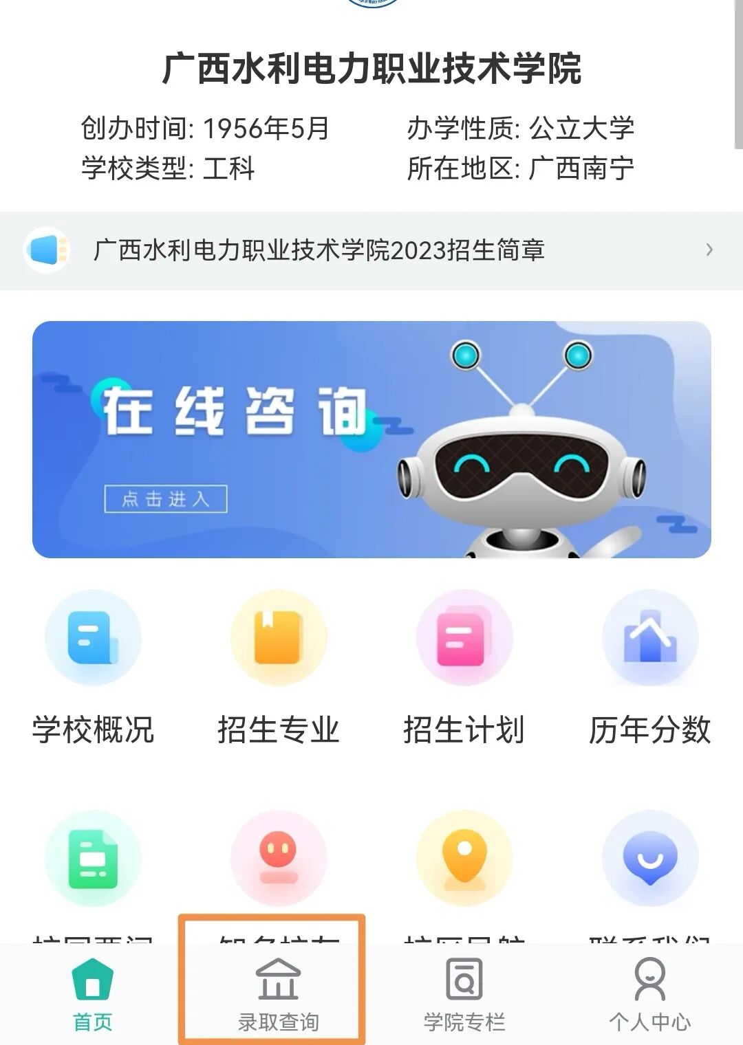 3、也可以搜索“广西水利电力职业技术学院”微信小程序,进入小程序查询录取结果。