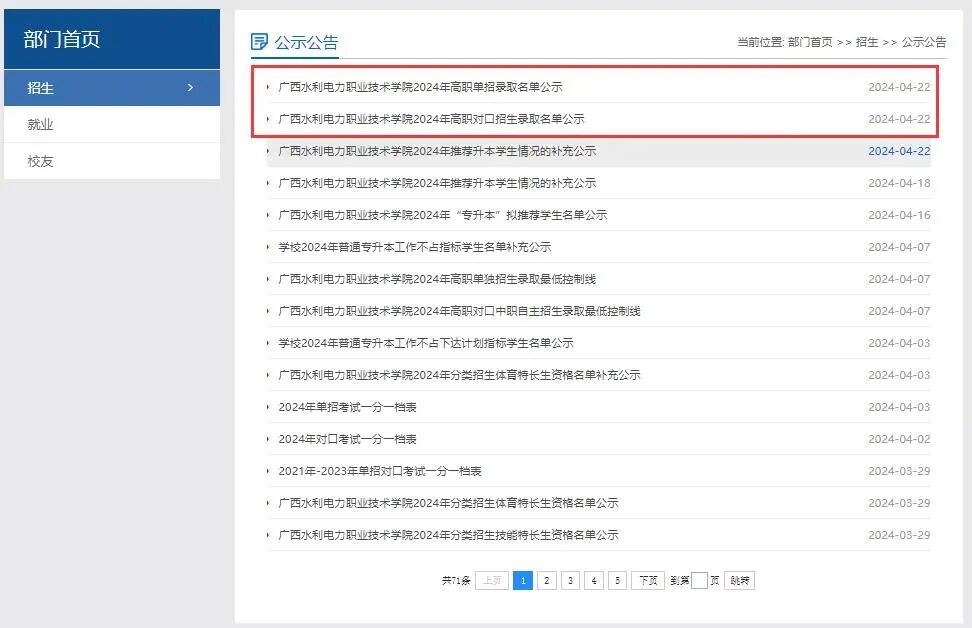 广西水利电力职业技术学院2024年高职对口招生录取名单公示