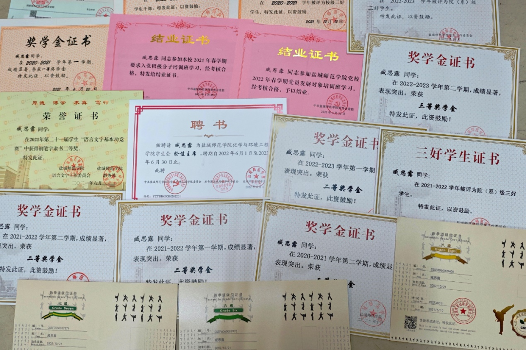 荣获 “微瑞杯”全国大学生化学实验创新设计大赛华东赛区二等奖、国际人才英语考试初级优秀证书、全国大学生英语竞赛C类二等奖、高中化学教师资格证等,曾多次获得国家奖学金、校级一等、二等奖学金。她积极组织并参加各种活动,被评为校级优秀学生干部、校级三好学生、校级优秀共青团干部等。现已考取江苏师范大学化学专业。