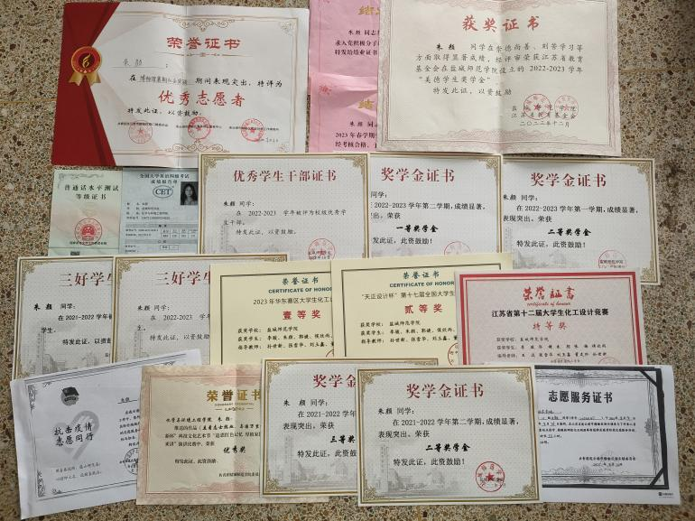 曾获美德奖学金,多次获得校一等奖学金,二等奖学金,三等奖学金,校、院三好学生,校优秀学生干部,校优秀共青团员。课余时间积极参与社会实践与志愿服务活动,获得社会实践先进个人、优秀志愿者;还参加了国家级、省级专业学科竞赛,获得“天正设计杯”第十七届全国大学生化工设计大赛国家二等奖、华东区一等奖、江苏省特等奖。