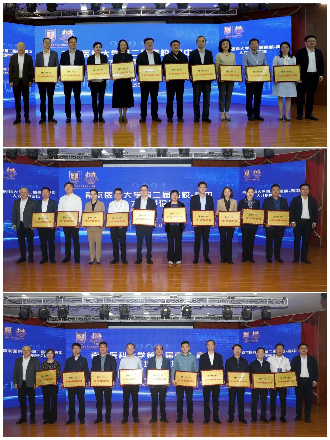 副校长沈瑞林作学校2023年本科生招生录取及“双高”合作情况报告。论坛同时举行了“南京医科大学青少年心理健康教育基地”授牌仪式,巡视员张鲤鲤和校长胡志斌为30所中学领导代表授牌。