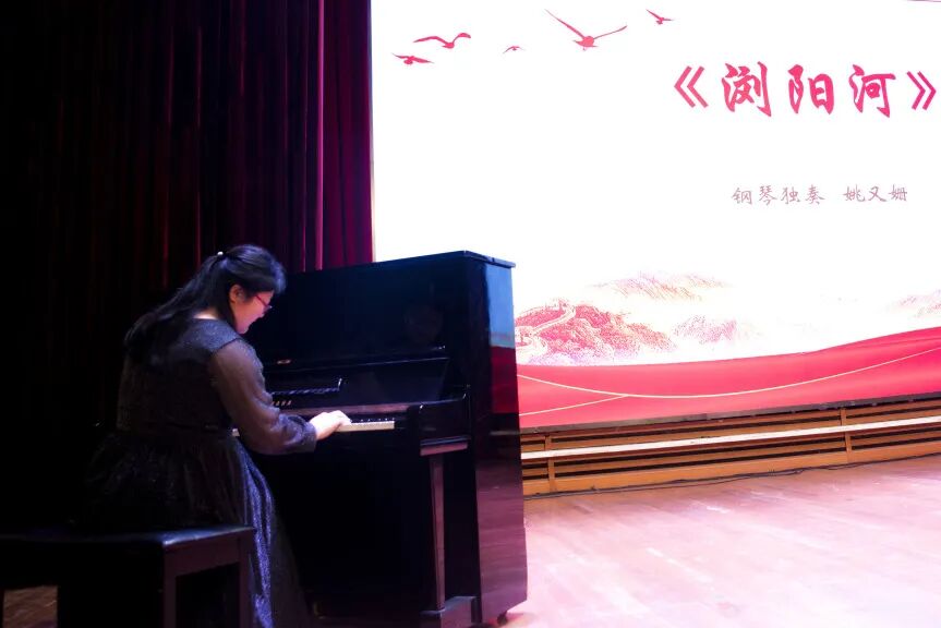 由南上海核心圈层党建宣讲团成员、中共上海市奉贤区委党校兼职教师周国良演唱、我校毕业校友姚又姗伴奏的《嘉陵江上》,反映了当时中国人民不甘当亡国奴、誓死反抗侵略者的决心。姚又姗钢琴独奏《浏阳河》,充满着革命的豪情和激情的旋律激励着青年奋勇向前。