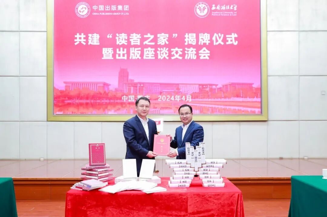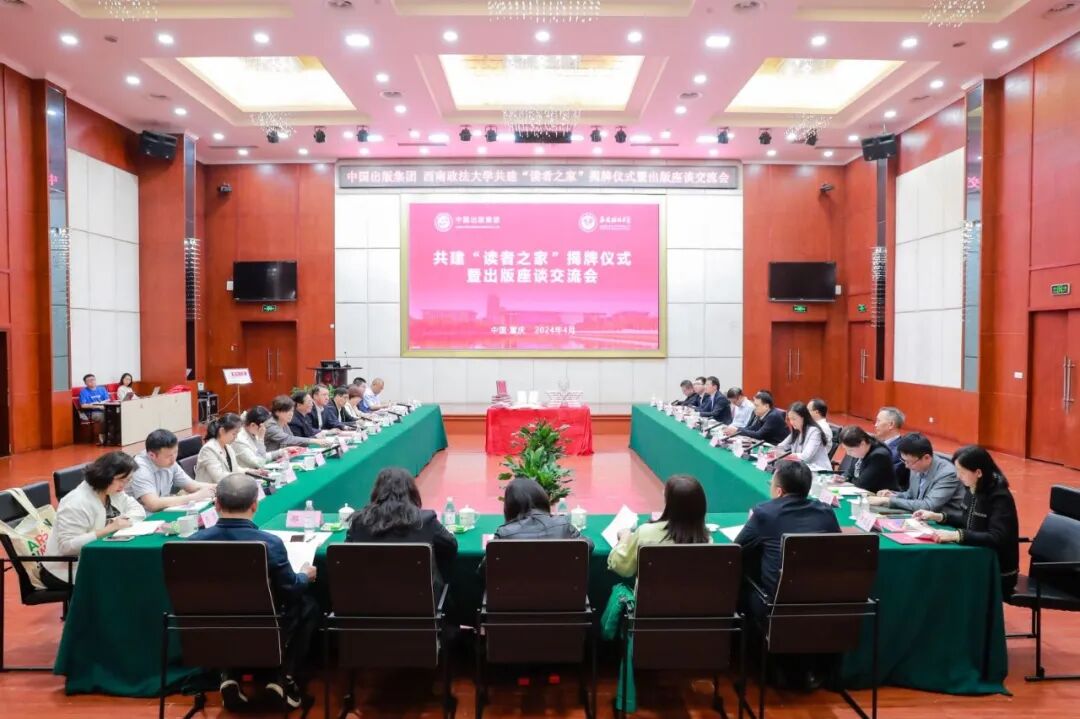 4月25日,中国出版集团与西南政法大学共建“读者之家”揭牌仪式暨出版座谈交流会在西南政法大学渝北校区毓才楼一楼学术报告厅举行。中国出版集团有限公司总经理、党组副书记常勃,中国出版集团有限公司党组成员、中国出版传媒股份有限公司总经理茅院生,重庆市委宣传部副部长、市新闻出版局局长马然希,西南政法大学党委书记樊伟,党委副书记、校长林维,党委常委、副校长李燕出席座谈会。中国出版集团相关负责人,市委宣传部相关部门负责人,西南政法大学相关职能部门负责人、师生代表参加会议。会议由西南政法大学党委常委、副校长李燕主持。