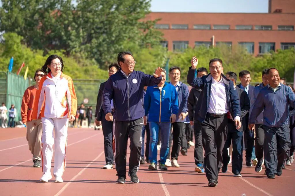 随后,校领导走上跑道,带领学生方队与教师方队进行健步走。