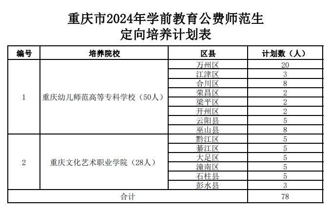 2024年重庆市计划面向14个区县定向培养五年学制初中起点学前教育公费师范生78名。培养学历为专科层次,学制为5年,培养学校为重庆幼儿师范高等专科学校、重庆文化艺术职业学院。