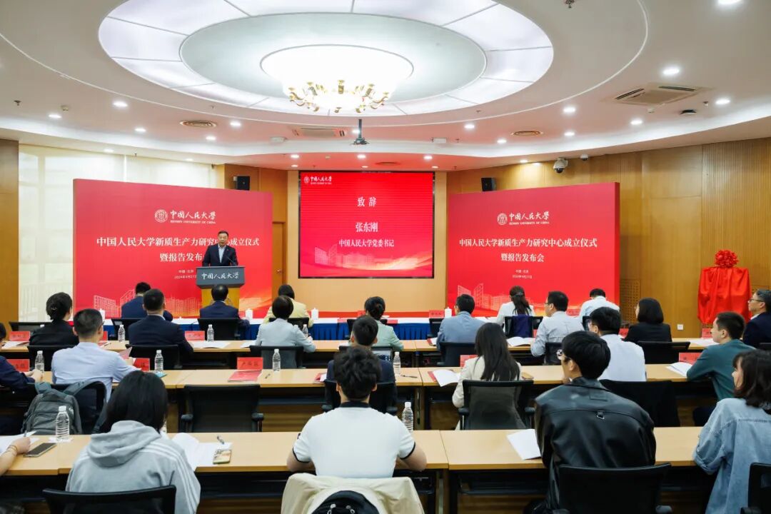 中国人民大学党委书记张东刚、国务院发展研究中心发展战略和区域经济研究部研究员李善同出席并致辞。中国国际经济交流中心总经济师陈文玲、中国社会科学院数量经济与技术经济研究所所长李雪松、北京大学副校长董志勇、中国科学院数学与系统科学研究院副院长杨翠红、中国宏观经济研究院战略政策室主任盛朝迅、清华大学战略新兴产业研究中心主任吴金希出席。中国人民大学副校长、应用经济学院院长郑新业主持成立仪式。中国人民大学机关部处、相关学院主要负责人,新质生产力研究中心代表参加。
