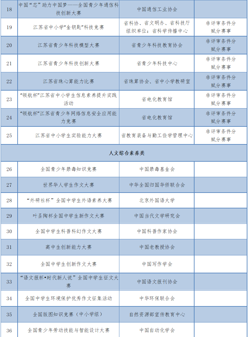 (三)特殊才能类。符合我校特殊人才培养需求的学生:以全国中小学生竞赛活动名单和全省中小学生竞赛活动名单为准(参见文末表格),要求高中阶段在各类竞赛中获得省级二等奖及以上;或经我校审查认可的在某一学科领域具有特殊才能者(须附详细证明材料)。