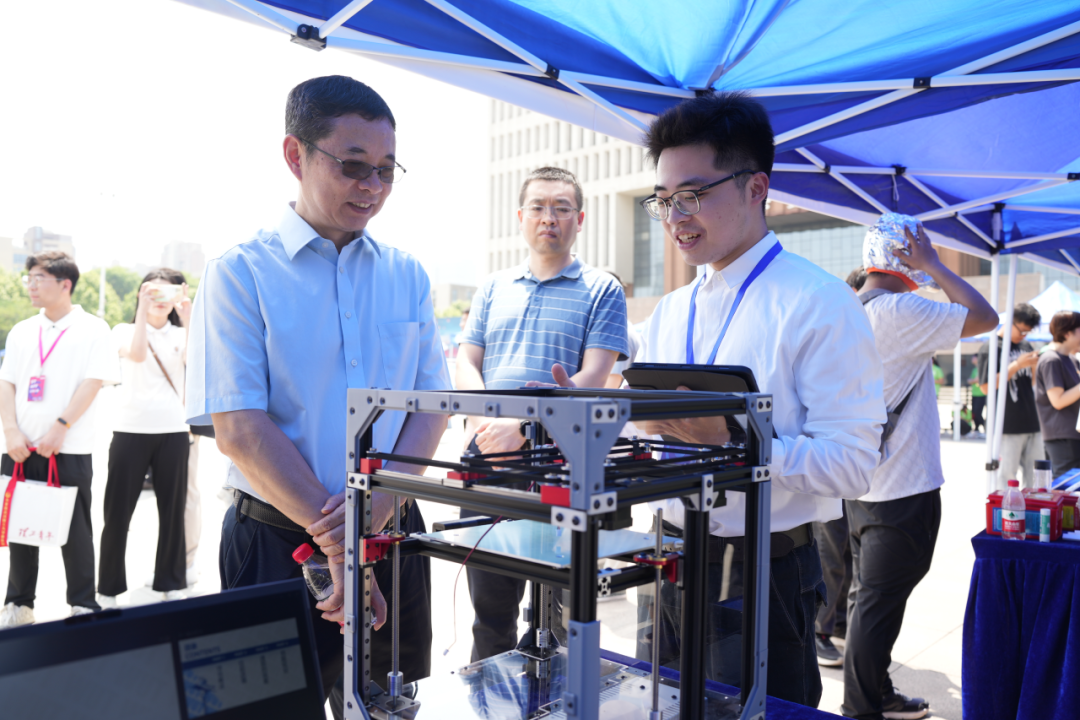 杨宗凯校长走到项目展示区与同学们亲切交流,兴致勃勃地询问项目的设计初衷、实现路径和应用情况。