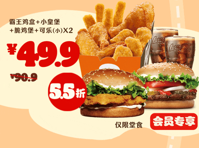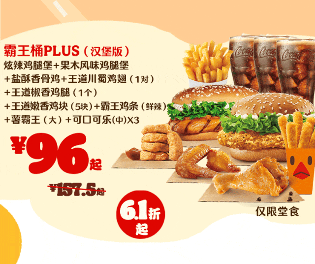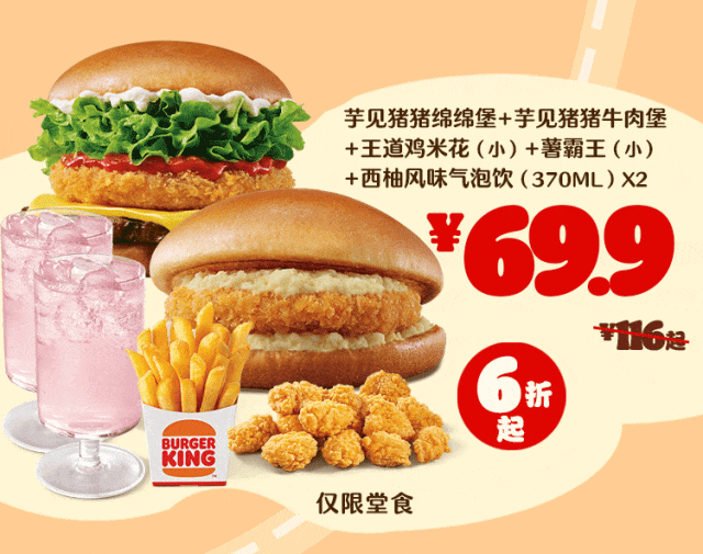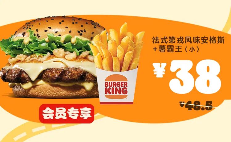 *非外卖渠道价格解释:图示如有划线价格,并非指原价,而是指不参加优惠活动情况下该产品在汉堡王指定门店销售的常规价格(或者指其中所含单品的常规单买价总和)或汉堡王门店建议零售价。除非图示另有解释,否则图示如有节省的金额或折扣比例,是与不参加优惠活动情况下在汉堡王指定门店单独购买该产品的常规价格(或者其中所含单品的常规单买价总和)或汉堡王门店建议零售价相比较。若需要查询当前门店销售的常规价格,可查看相应门店菜单或详询店员。
