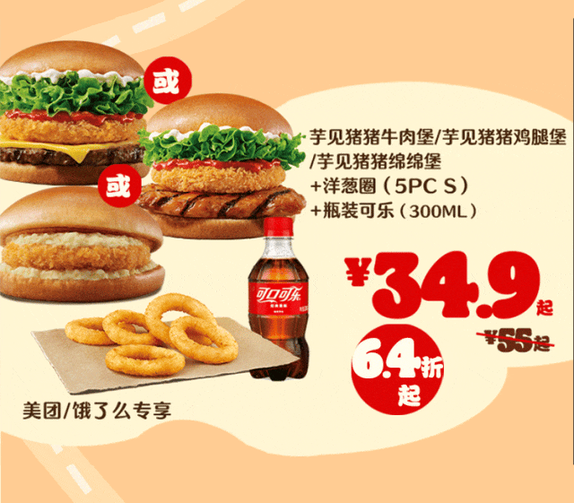 *外卖渠道价格解释:图示如有划线价格,并非指原价,而是指不参加优惠活动情况下该产品在汉堡王外送销售的常规价格(或者指其中所含单品的常规单买价总和)或汉堡王外送建议零售价。除非图示另有解释,否则图示如有节省的金额或折扣比例,是与不参加优惠活动情况下在汉堡王外送单独购买该产品的常规价格(或者其中所含单品的常规单买价总和)或汉堡王外送建议零售价相比较。