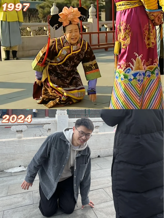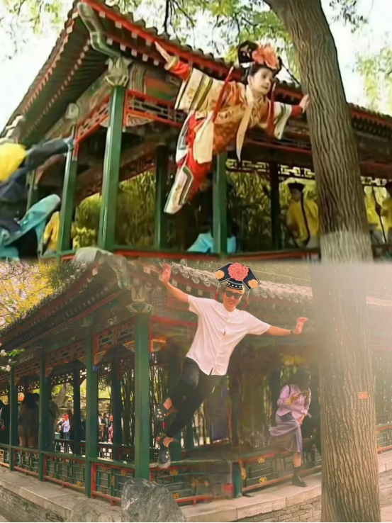 无独有偶,@方块儿 的戏精老公去恭王府打卡拍照,费尽九牛二虎之力,想要cos一把还珠格格,可惜景区不让攀爬文物,他只能好说歹说,央求@方块儿 帮忙P图,这下才圆了自己的公主梦。