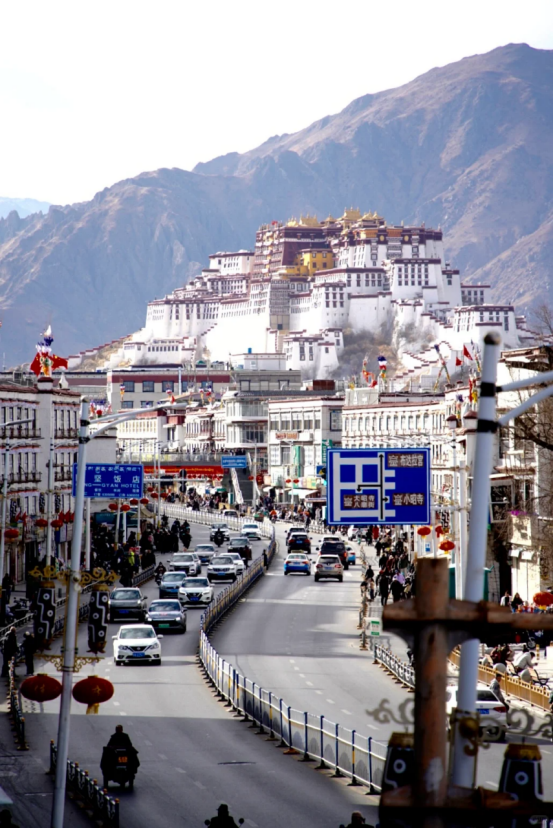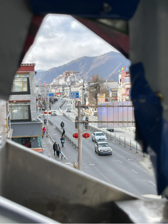 不看还好,一看吓了一跳。这个破洞,也就是去星月菩提的过街天桥上的一个孔位,竟然可以完整地拍到布达拉宫。按照她的说法,感觉比星月菩提的观景台还出效果。