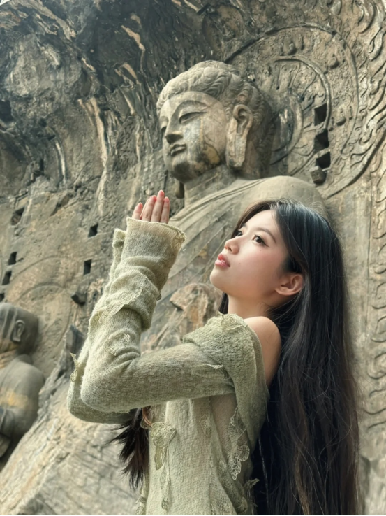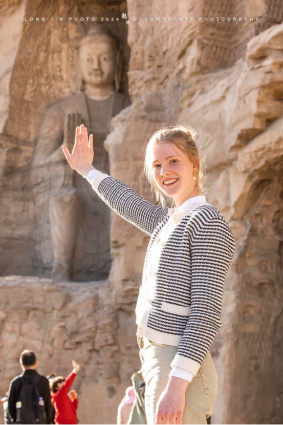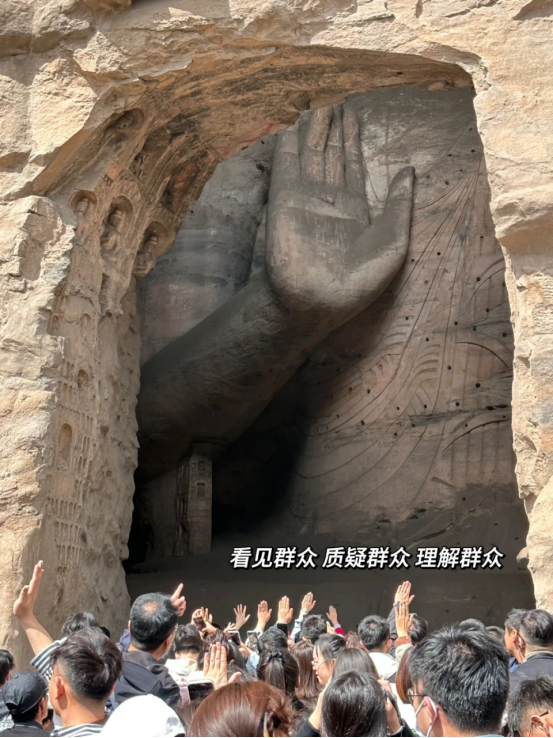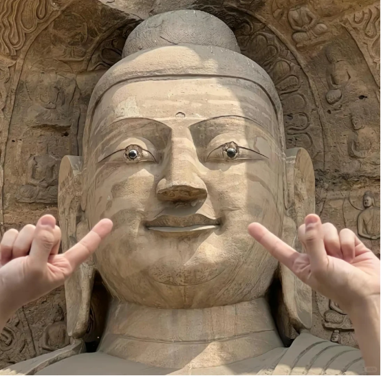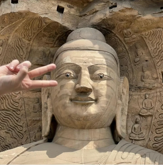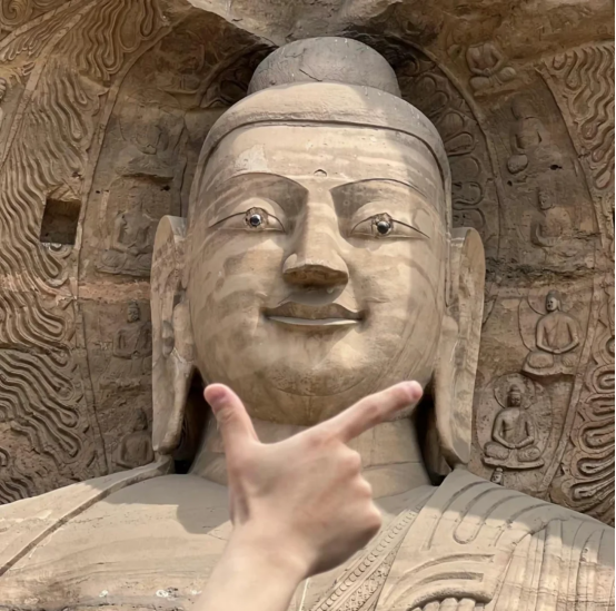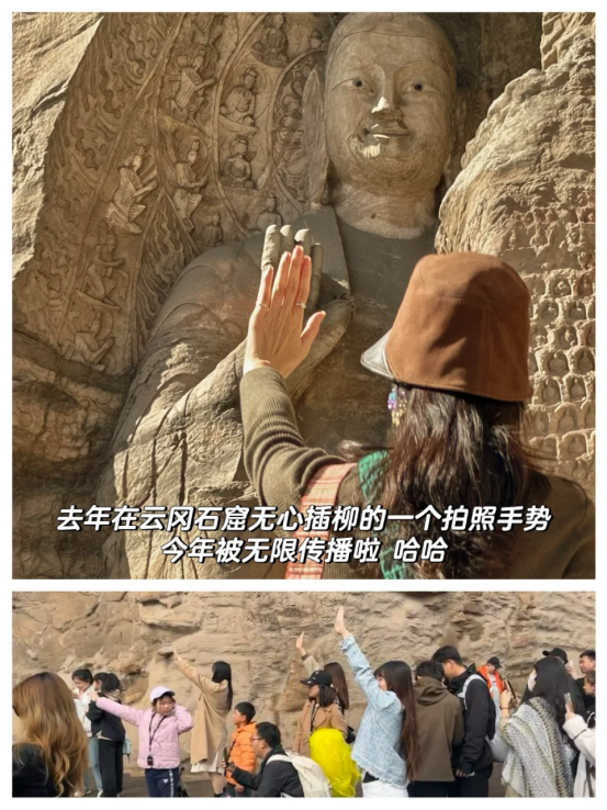 最开始,是@老徐在慵懒星球 和小伙伴去云冈石窟游玩的时候,发现最火热的打卡点人太多,她们便没有排队,而是选了另外一个位置拍了几张跟佛像击掌的照片。