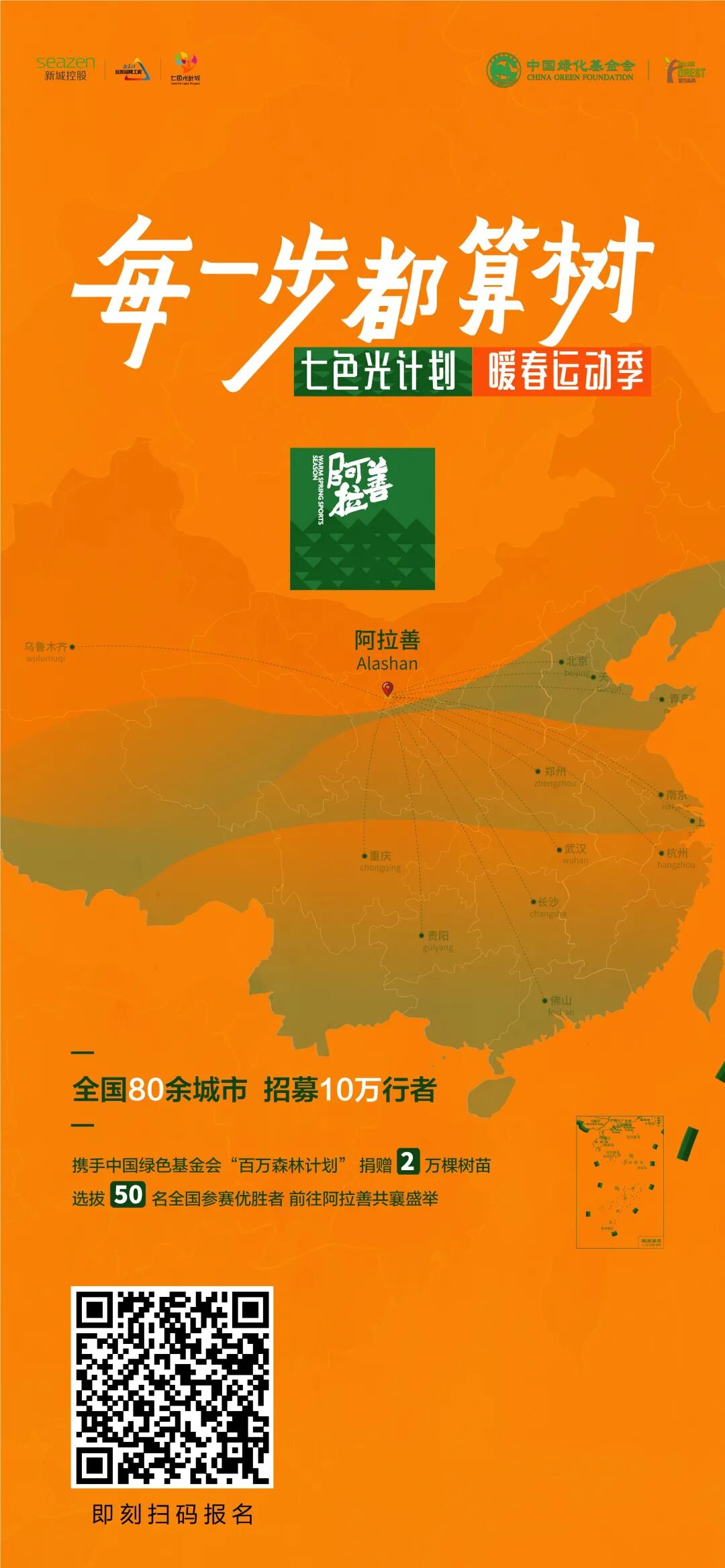 今年,我们诚邀远方的你和我们一起践行公益,享受户外阳光,参与徒步活动。2022年3月12起,全国80余城招募10万行者,携手中国绿色基金会“百万森林计划”,捐赠2万棵树苗,选拔50名全国参赛优胜者,前往阿拉善共襄盛举。
