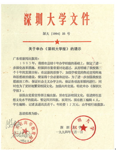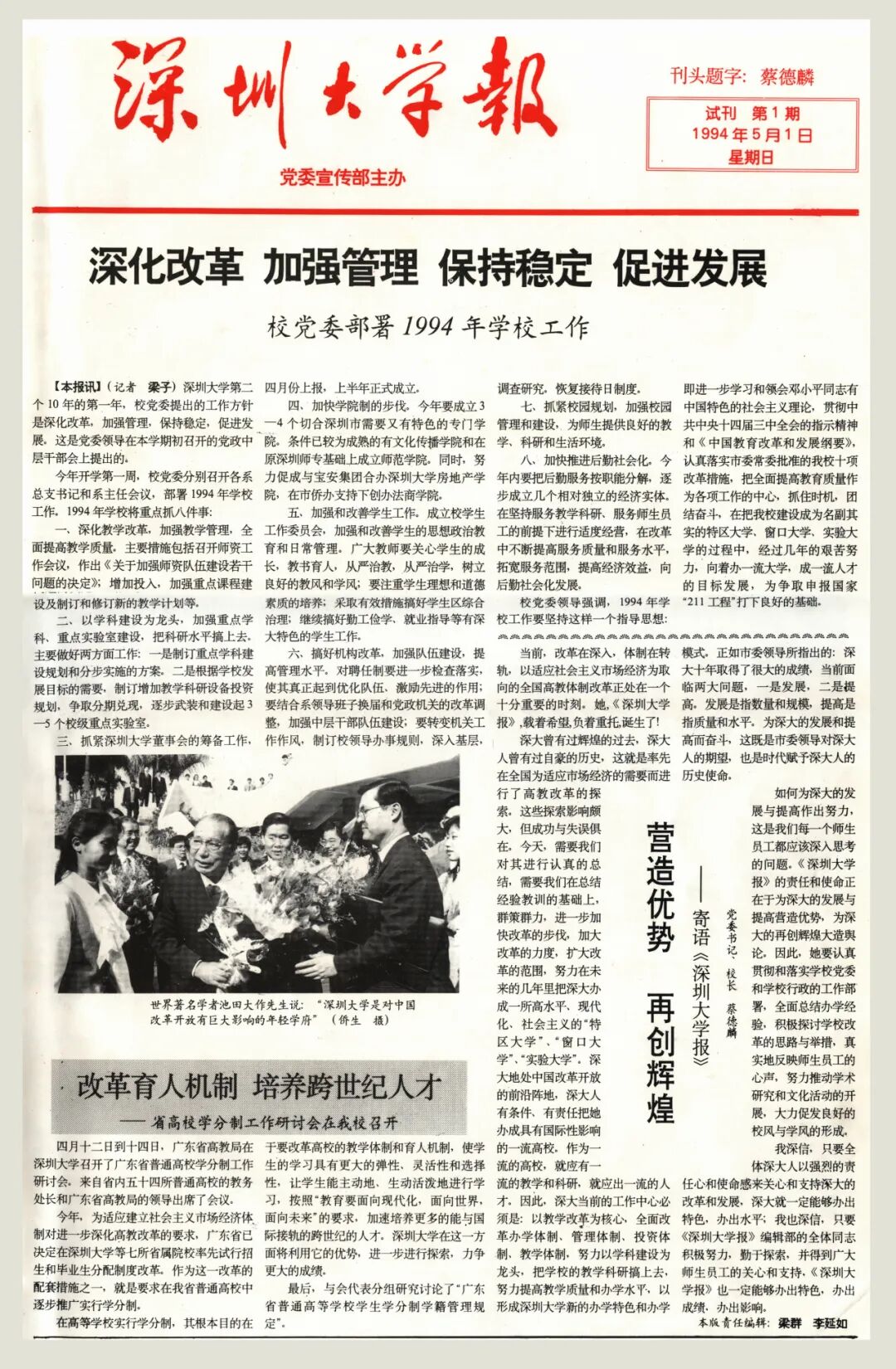 1994年5月1日,为响应深圳大学第二个十年发展目标,《深圳大学报》应运而生,承担起“为深大的发展与提高营造优势,为深大的再创辉煌大造舆论”的重大使命。学校期望《深圳大学报》要“全面总结办学经验,积极探讨学校改革的思路与举措,真实地反映师生员工的心声,努力推动学术研究和文化活动的开展,大力促发良好的校风与学风的形成”。为此,学校调动《深圳大学学生报》的学生到《深圳大学报》编辑部,风风火火地开启了老师带领学生共同创办校报的时尚先例。