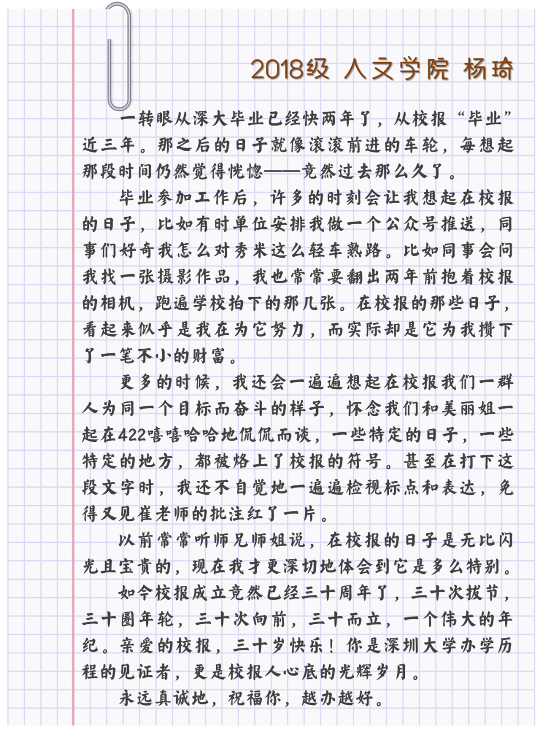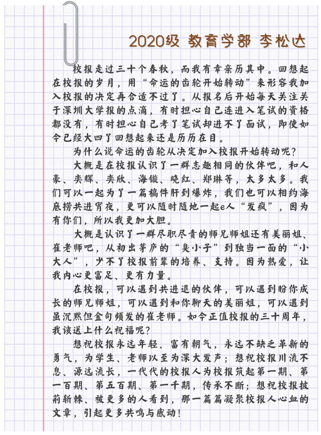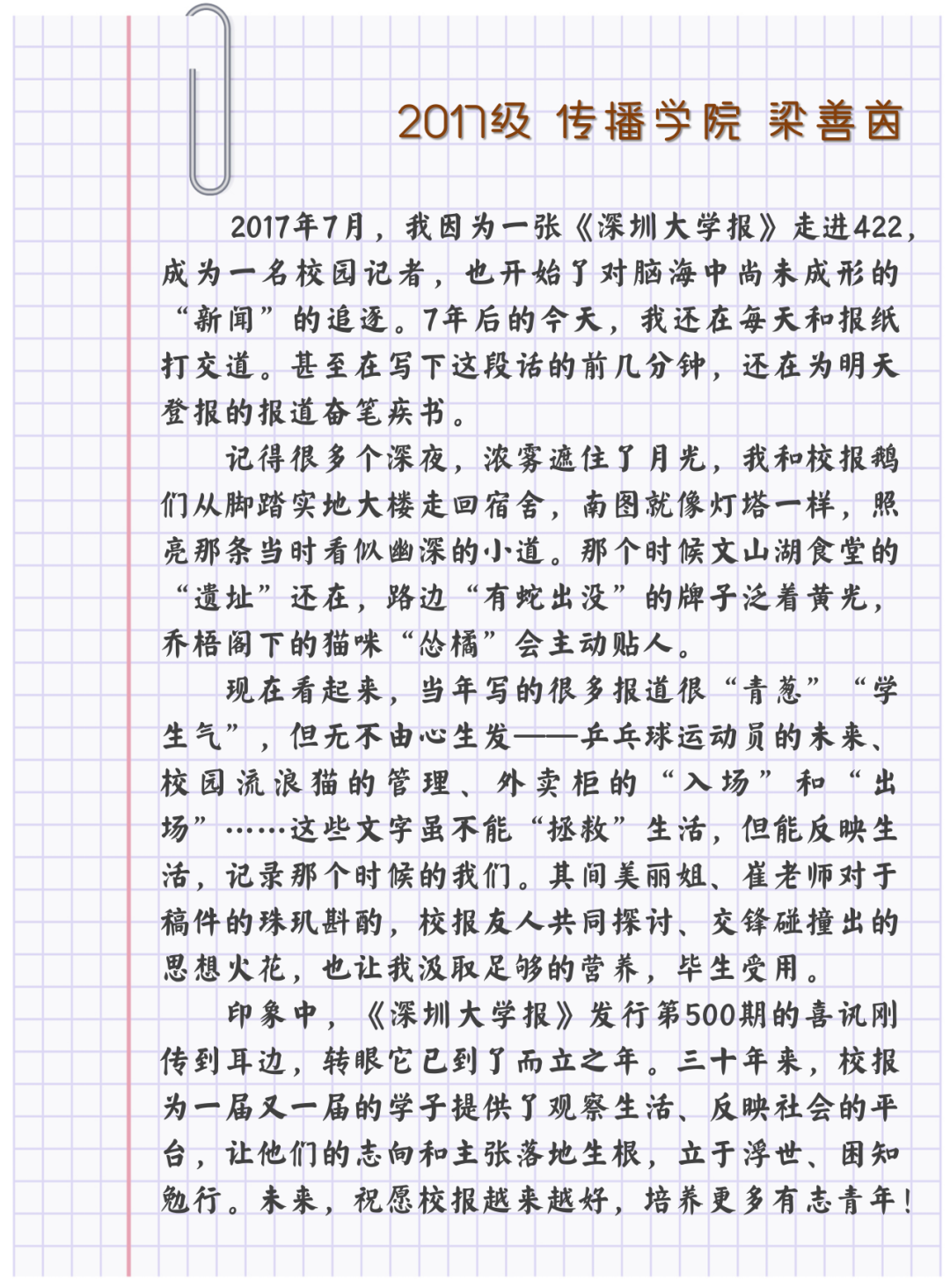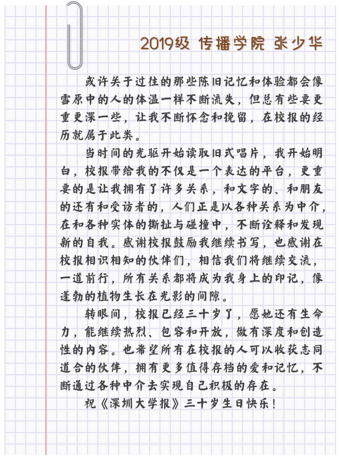 《深圳大学报》的蓬勃发展凝聚了三十届校报人的心血,尽管许多学生毕业,已走向八方、奔赴前程,薪火传承的乐章从不以毕业为终止符。2019级的学生记者石耿珲回忆自己第一次来校报编辑室的下午,2017级的校报师姐梁善茵从刚刚铃响下课的教室赶来,带着他走进422。时值校报创刊25载,那些饱含灵动文字的报纸精心装订成一本本合集,正是梁善茵为他逐页翻开,细心讲解,将新闻业的理想信念与厚重的历史底蕴深植于他的心里。
