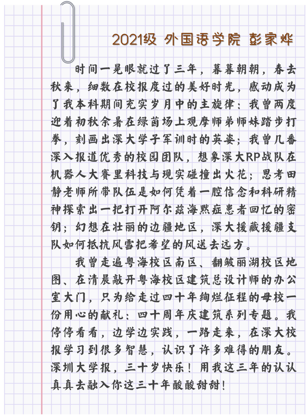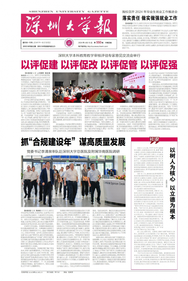 历经三十载,《深圳大学报》始终坚持正确的政治方向和价值导向,紧紧围绕学校工作主题,积极捕捉校园热点,充分发挥校报在新闻舆论引导、思想政治建设、精神文明建设、大学文化建设等方面的重要作用。博学慎思,笔耕不辍,校报将继续以“铁肩担道义,妙笔著文章”的责任感和使命感,奔赴深圳大学的未来。