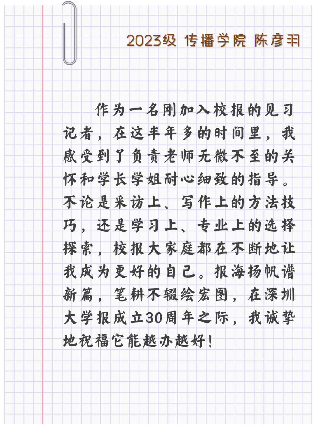 三十年来,代代学生记者以坚定的笔触,肩负起见证者与记录者的神圣使命。紧跟时政,报道学校的每一件大事,传播校园文化,勇于创新报道形式,持续而用心记录深圳大学建设与发展的轨迹,为校史提供了一帧帧精准而生动的事件时间表。从1999年广东省大学生运动会期间,承担两天出版一期报纸的高强度工作;到2008年抗震救灾期间,不分昼夜地用两天时间紧急增发特刊报道校园的哀悼活动;再到2023年深圳大学四十周年华诞之际,精心策划推出了一系列以校庆为主题的专栏、特刊和推文,全方位、多角度地展现了深圳大学四十载的辉煌历程与丰硕成果。校报人用笔墨脚踏实地地记录了深大青年“自立、自律、自强”的成长轨迹,书写了深圳大学筚路蓝缕、攻坚克难的厚重历史。