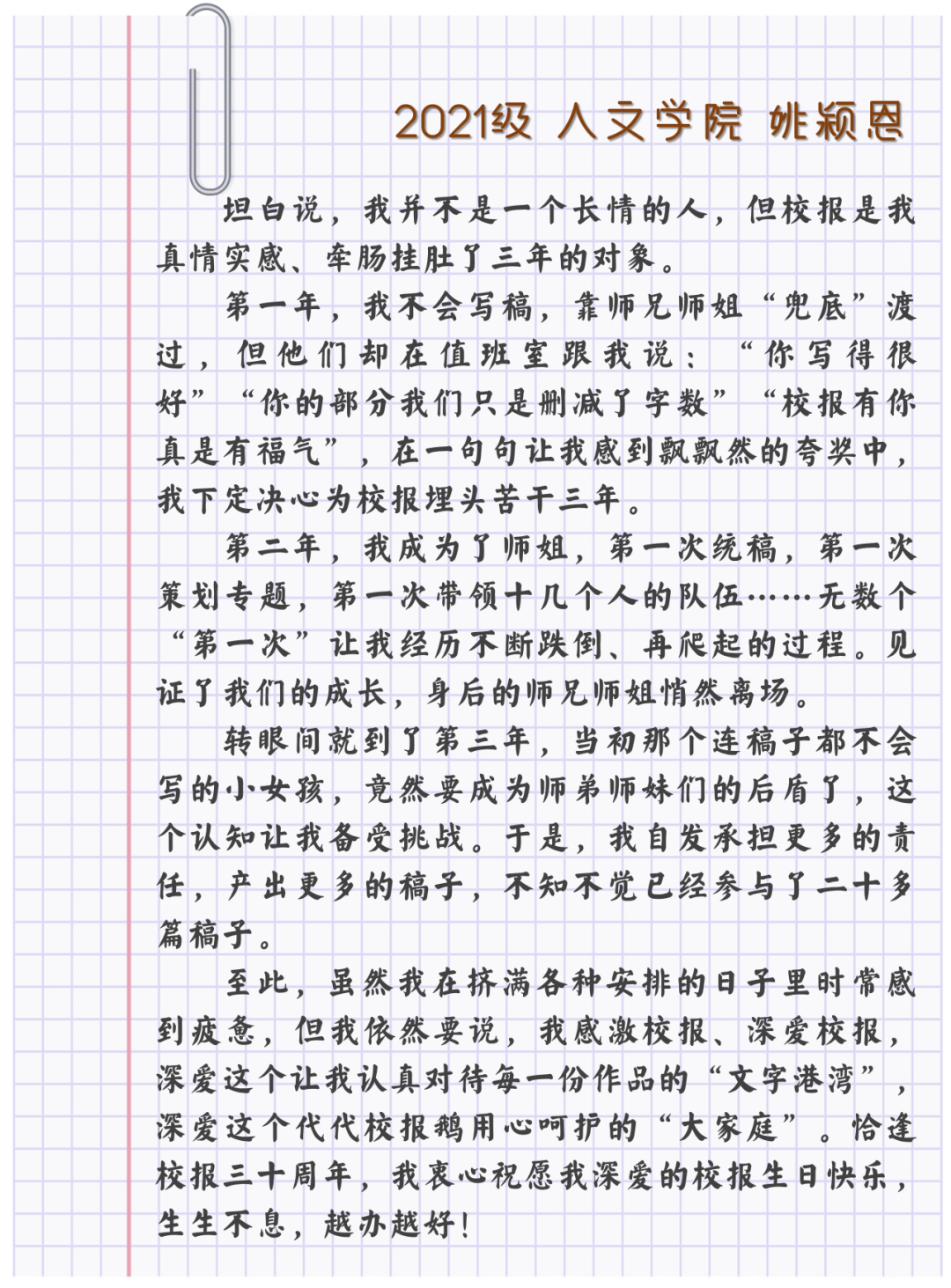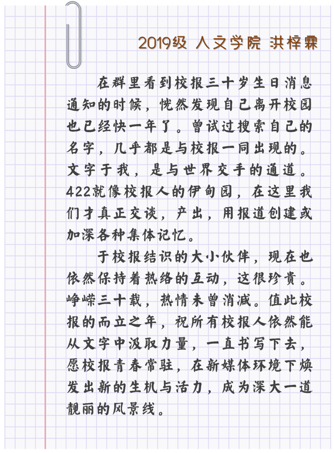 毕业后,石耿珲在地市级媒体里担任记者,虽与同在省级媒体担任记者的梁善茵无工作交集,但始终记挂着校园期间的那些教诲,在师姐作品中的字句间寻觅进步的足迹。对石耿珲来说,向前人问来时路,为后人铺脚下路,这便是校报人的精神纽带,是校报人奔赴前程的力量源泉。