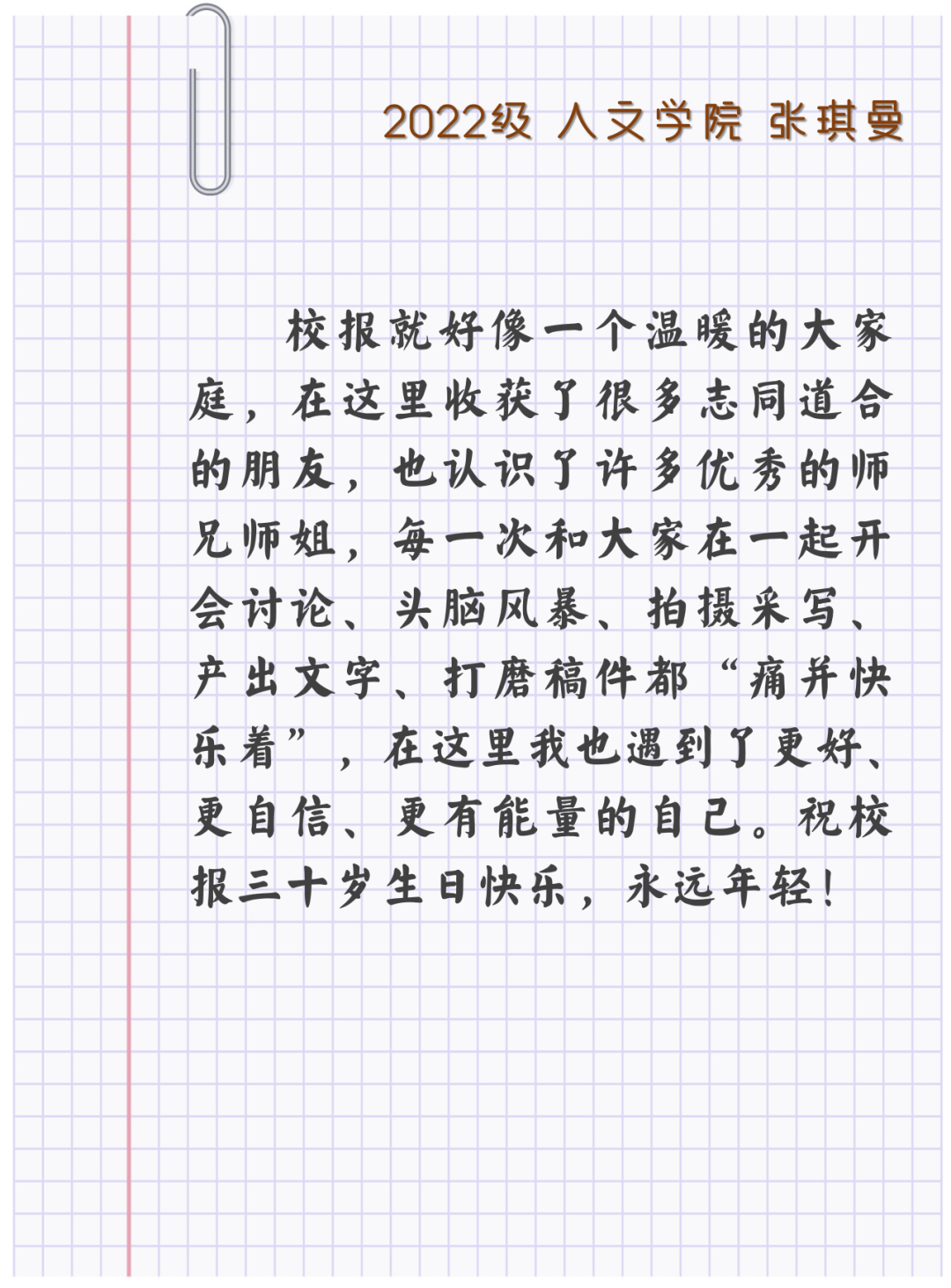 三十年来,校报人在传承中寻求创新,在坚守中创造。从黑白套红到彩色版面的华丽转身,从小报到大报的蜕变升级,从环保纸到新闻纸的跨越发展,每一代校报人都牢记创刊之初的责任与使命。