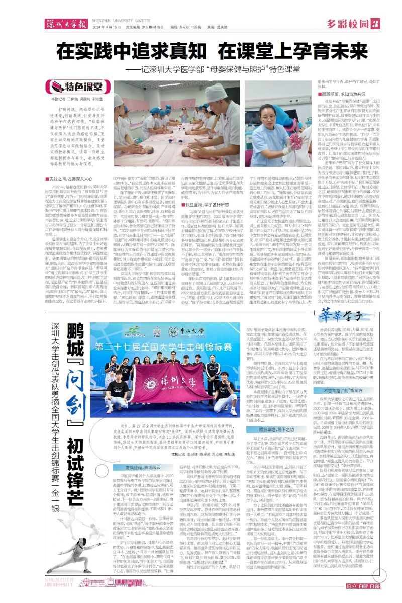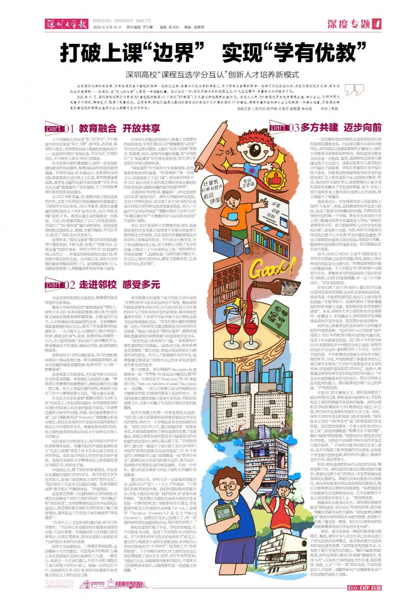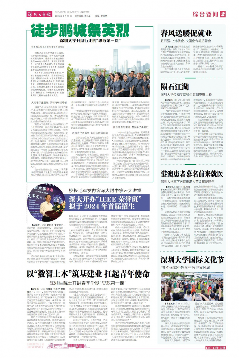 2024年3月,《深圳大学报》结合学校文化的自身特色,对报纸版头的色彩与版面栏目模块设计进行了全面优化。校报各版面栏目内容丰富多彩,除了报道学校重大新闻外,二版推出“社论”栏目,聚焦热点引领思想潮流;三版开设“荔人励事”“莘莘学子”“特色课堂”等栏目,展现校园生活的多姿多彩;四版则以特稿的形式呈现兼具新闻性和思辨性的深度专题,引导读者深入思考。