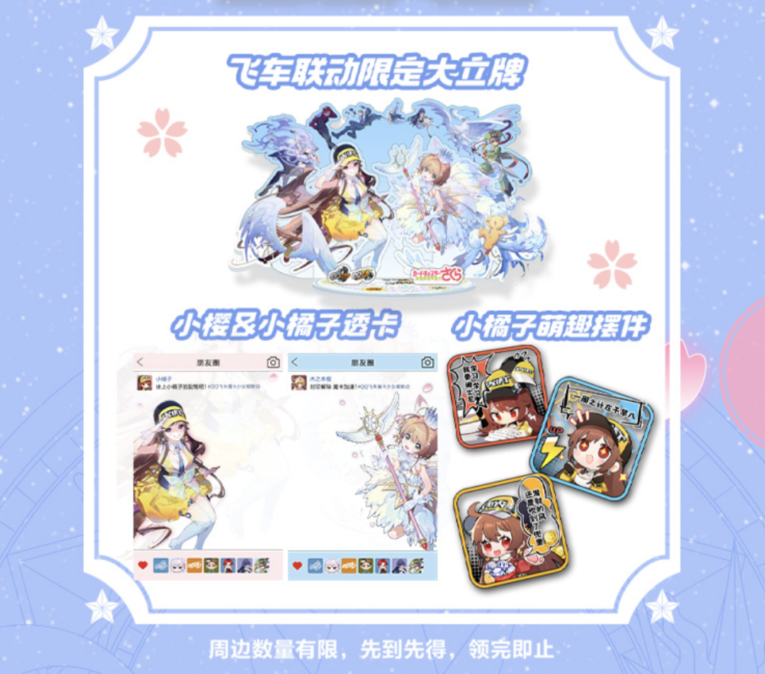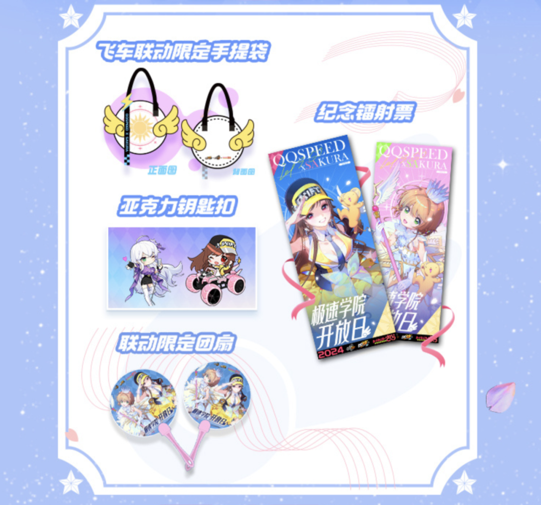 小橘子还为来到现场的车手们准备了见面礼!飞车联动限定手提袋、纪念镭射票、亚克力钥匙扣、联动限定团扇等高品质无料惊喜周边免费放送~品质升级,数量有限,先到先得,领完即止!
